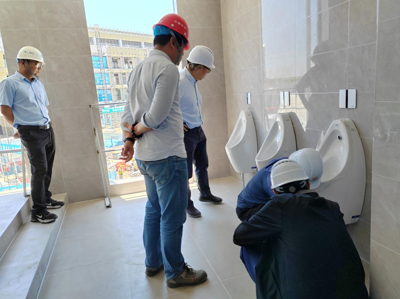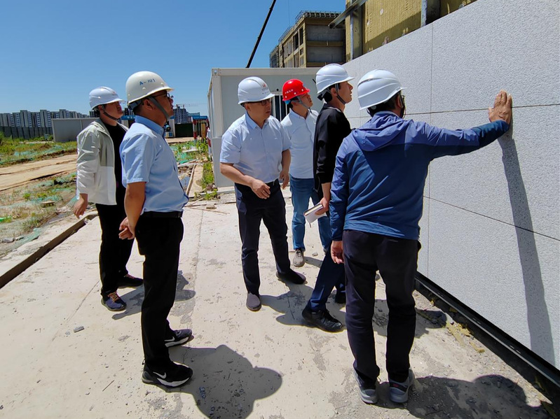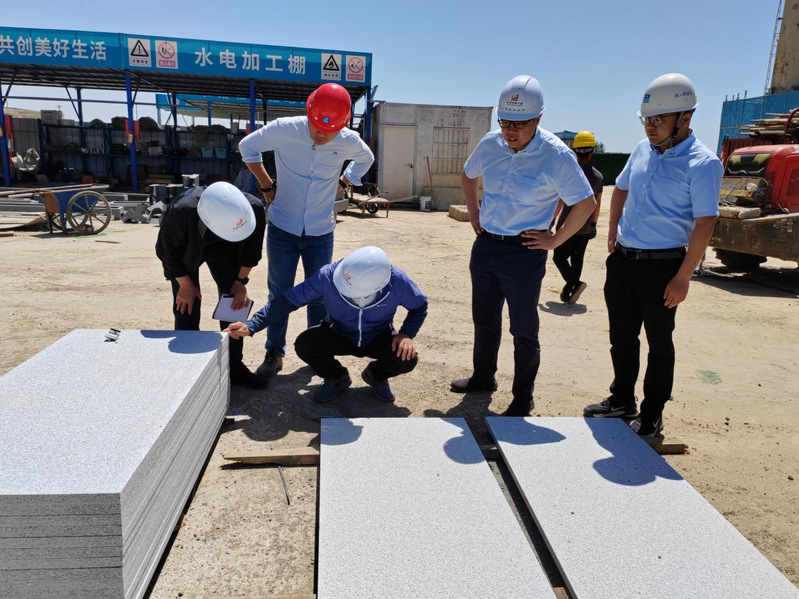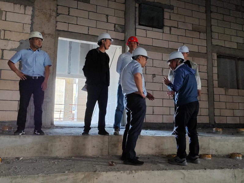 周老师一行在施工现场,重点查勘新校区一期二标段项目使用的幕墙石材及钢骨架、卫生间墙地砖、师生活动中心座椅通风管等方面,周老师仔细介绍外墙龙骨、防火玻璃、石材等原材料甄别选用的方法,对我校抓牢项目选材关、保证项目质量提供了宝贵经验。
