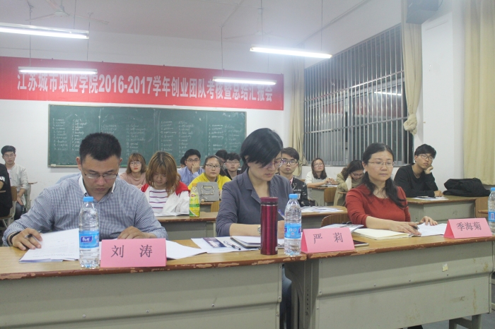 4月17日晚上6:30分,我校在定淮门东校区教学楼108教室举行2016-2017学年创业团队考核暨总结汇报会。南京市人社局创业导师严莉、学生工作处(就业指导中心)季海菊处长、刘涛副处长担任评委,来自两个校区的10个创业团队参加了本次考评。
