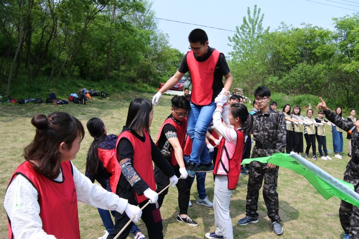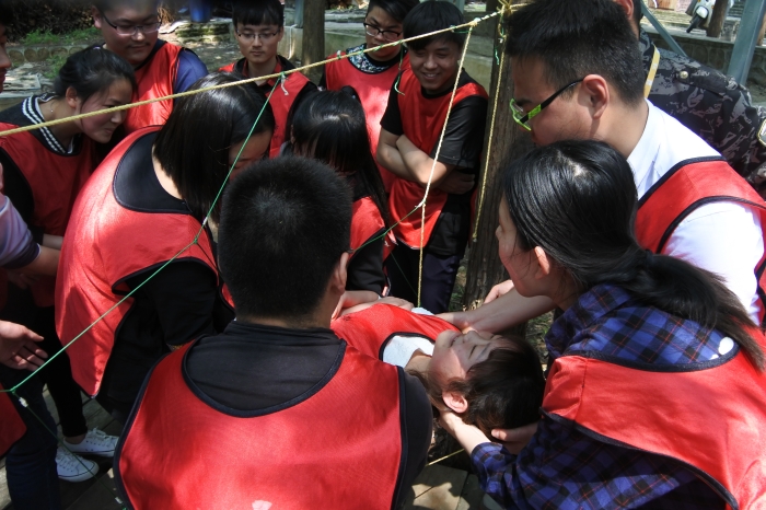 当天天气很棒,同学们兴致勃勃奔赴南京青未了素质拓展基地。一开始他们还有点懵懂,但在教练的引导下,气氛迅速活跃起来,组成了老中医、反贪局、战狼、红龙队四个跃跃欲试的小组。各小组在活动中迅速拧成一股绳,在各个项目中你争我赶,在竞争中不断进步。在“生死电网”环节中,小组中任何人身体任何部位一旦触碰到网,全队就需要重新来过。一开始大家跃跃欲试,纷纷“触电”,铩羽而归。后来大家冷静下来,认真研究完成任务的方案,进行严密分工,有人指挥、有人帮助、有人监护,“抱、抬、托、举”都用上了,终于小组的每一个成员都顺利通过电网。“毕业墙”环节也扣人心弦。这个环节中,82名同学都要依靠团队的力量爬上5米高墙,一开始很多同学担心无法完成任务,但在教练的引导下,大家纷纷出谋划策,群策群力,每一个同学都成功登上了毕业墙,让不可能变为可能。其它活动信任背摔、动力圈等活动也让大家惊奇地发现团队的力量有多么不可思议……
