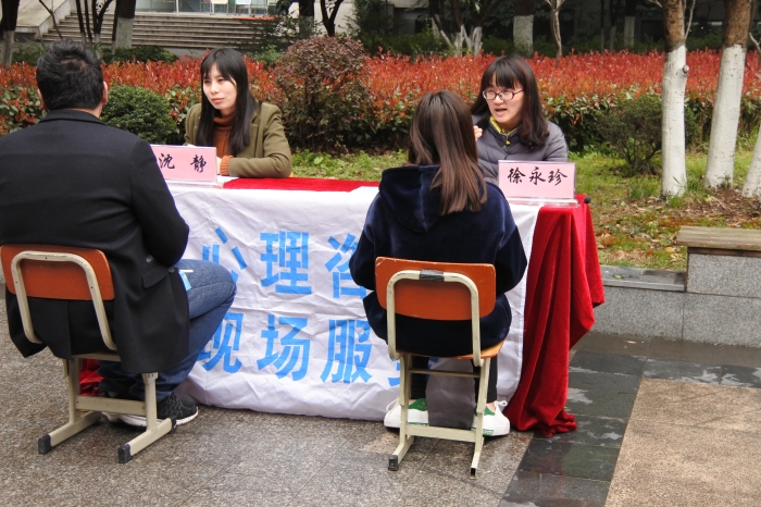 2.心理健康周广场宣传活动。3月20-21日中午,学工处分别在两个校区举办广场宣传活动,开展现场咨询、心理知识竞猜、心理游戏等“3·20心理健康教育周”开幕式活动。活动包含五个主要环节:现场咨询、心理知识竞猜、心理测试体验、宣传品发放、心理游戏。在现场咨询环节,学校专兼职心理咨询师走出略显神秘的心理咨询室,与鼓足勇气克服羞涩的同学们面对面,探讨了他们面临的宿舍矛盾问题、心身健康问题、情感交友问题等;在宣传品发放环节,学工处结合春季天气多变、人体内分泌旺盛、大学生存在心理易感性等特点,提前编印了精美的“认识抑郁克服抑郁”宣传册;在心理知识竞猜和心理游戏环节,校学工处微信公众号、心理协会分别设置了答题有奖、“最佳脸谱T恤DIY”、“鸡同鸭讲”、“跳绳答题”等活动。