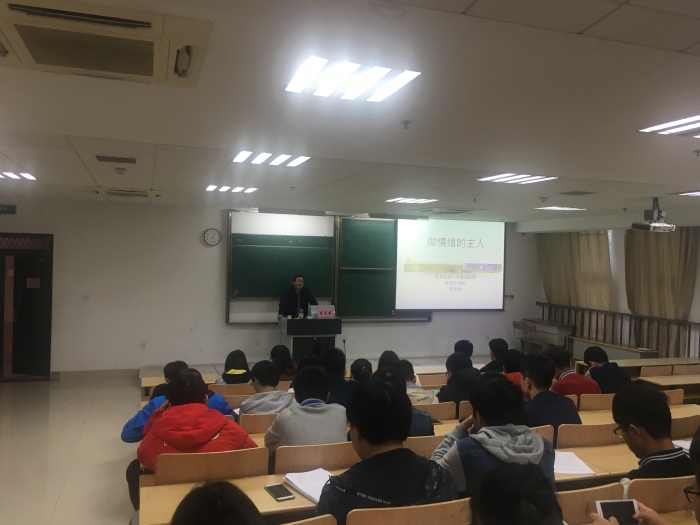 3. 情绪健康专题讲座活动。3月27日下午,南京脑科医院心理科主任李箕君应邀来我校为大一新生开展了题为“管好情绪,赢得人生”的主题讲座。李主任解释了与情绪有关的个人因素,告诉大家如何通过识别自己的情绪、察觉他人的情绪、自我激励等办法提高情商。