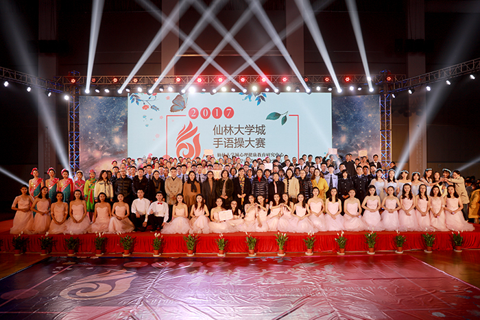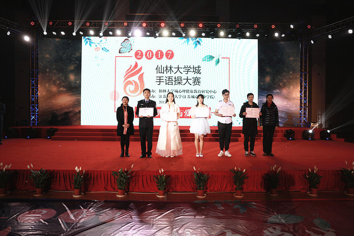 12月6日下午,由江苏省仙林大学城心理健康教育研究中心主办、我校承办的2017年度手语操大赛在应天校区体艺馆拉开帷幕。此次大赛以“心路携手,与爱同行”为主题,意在传递温情与友善,鼓励大家心手相连追寻幸福和梦想,祝愿祖国美好与繁荣。校党委副书记、副校长金丽霞,仙林大学城心理健康教育研究中心主任曹天安和23所高校2000多名师生观看了比赛。省教育厅高校学生处正处级调研员马晓红应邀观赛。