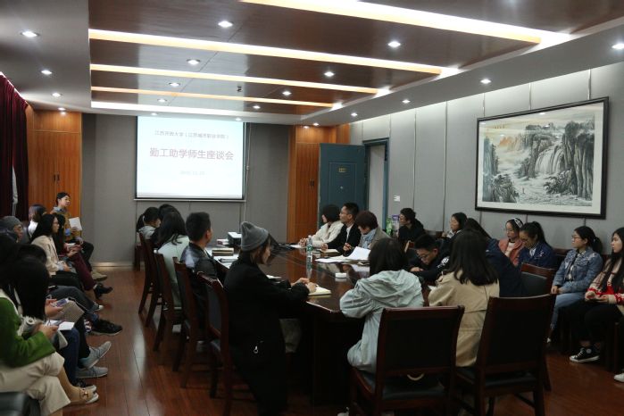 为进一步了解我校勤工助学学生在校学习、工作、生活情况,11月27-28日,我校分别在应天校区、古平岗校区召开了勤工助学师生座谈会。学生工作处处长季海菊、资助服务科科长丁云、各勤工助学用工部门指导老师及70余名勤工助学学生代表参加了座谈,会议由资助服务科黄小宇老师主持。