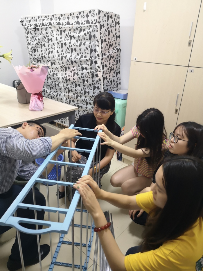 6月19日下午,当金书记再次踏入该宿舍时,宿舍面貌焕然一新,同学们在辅导员老师的指导下,将宿舍做了精心布置,桌上再也不见杂乱的物品,取而代之的是让人身心愉悦的美丽花束,宿舍前后对比鲜明,窗明几净,整洁舒适。金书记还特地为同学们准备了一份精致的礼物:鞋架与书架,并在现场与同学们一起组装,同学们深受感动,也为金书记献上一束康乃馨以表达对老师和学校的谢意。金书记再次勉励同学们,既要加强专业知识的学习,也要继续保持宿舍良好风貌。同学们表示将谨记金书记的教诲,一如既往地维护好宿舍,共同营造温馨、和谐的宿舍氛围。