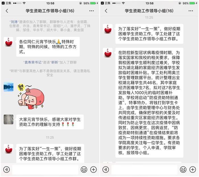 考虑学生可能出现居家隔离等诸多不便情况,学校启动“防疫资助特别通道”特事特办,免除了学生申请,学院汇总等环节,由财务处、学生工作处与学院共同完成发放工作,从名单确定到全部发放到学生手中,仅用了三个小时。在元宵佳节这一阖家团圆的日子里,将学校的关爱及时传递给重灾区家庭经济困难学生。