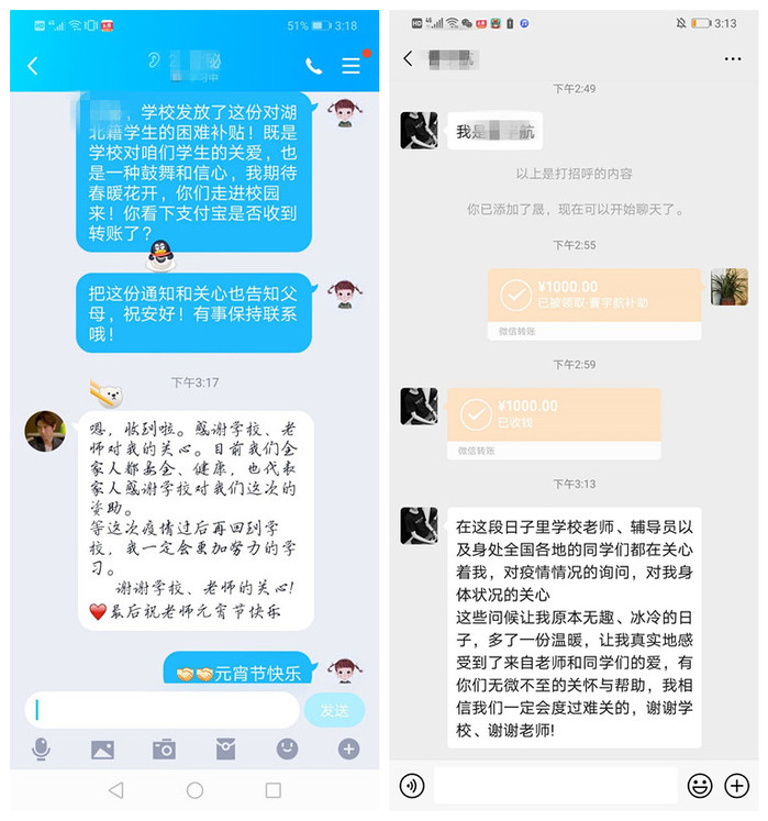 收到补助的同学们纷纷主动联系老师,他们激动地表示:战疫情,暖人心!疫情当前,学校总是把学生放在第一位,感谢学校老师对疫区学生的关爱和帮助,这份意外的资助如雪中送炭,给他们带去的不仅仅是物质上的帮助更是精神上的鼓舞,期待疫情结束之日,回归学校,努力学习,回馈学校!