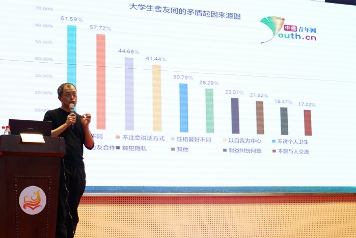 在培训会中,朱老师首先谈及宿舍长的身份与担当,他说,宿舍长是维护宿舍领头人,同时也是老师与舍友们之间联系的重要桥梁,宿舍长应了解心理健康知识,帮助室友共同成长,调整心态,适应大学生活。随后,朱老师从宿舍关系基本现状、宿舍关系案例简介、CBT技术、实战演练、实用工具五个方面展开讲解。他重点用CBT技术将寝室人际关系的处理讲深讲透,帮助同学们看待问题有角度,处理问题有方法。朱老师用诙谐幽默的语言讲述咨询中的常见案例,向大家介绍CBT在宿舍矛盾处理中的运用,在场同学踊跃地提出自己宿舍生活中的疑惑,朱老师热情解答并提出建议。