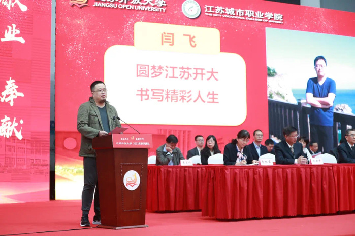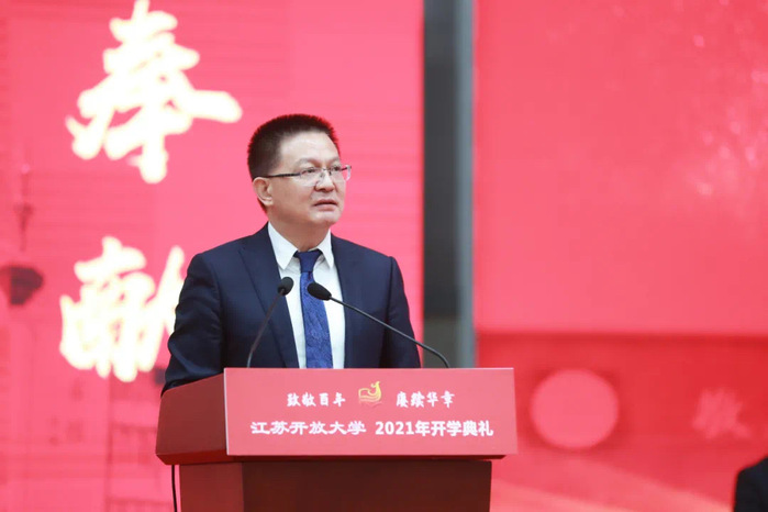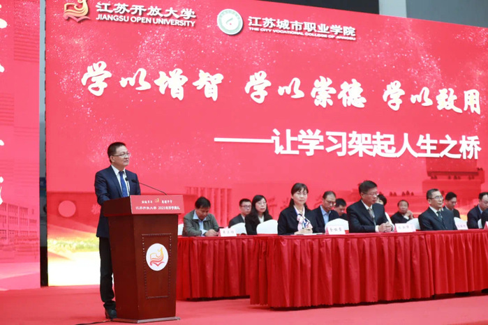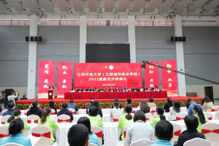 金秋送爽,丹桂飘香。10月30日上午9时,江苏开放大学(江苏城市职业学院)2021级新生开学典礼在应天校区体艺馆举行。来自全省73家市县开放大学的3万多名开放学员和来自祖国17个省市、16个民族的1200多名高职新生云端共聚一堂,校党委书记王建明、校长崔新有等校领导出席典礼,各市县开放大学校领导、各部门党政负责人、教师代表、新生班班主任、学务导师和全体辅导员参加。典礼由校党委副书记、副校长金丽霞主持。
