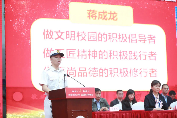 新生代表先后发言。2021级土木工程专业开放学员、南京南大智慧城市规划设计股份有限公司副院长闫飞同学用一路拼搏,孜孜求学的经历告诉同学们要养成终身学习的好习惯,才能为绚烂人生做更好的准备。建筑工程学院2021级建筑智能化技术专业蒋成龙同学表态要将军人的情怀和品质融入校园生活中,用实际行动和责任担当,展现新时代大学生的风采。