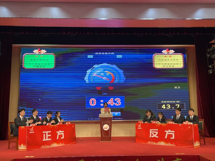 正方认为要先实现兴趣“小我”才能服务社会“大我”;反方认为大学生择业要去除利己主义,主动适应社会发展趋势。攻辩环节,正方突出强调“低层次需要”被满足的重要性,就相关质疑进行辩驳解释;反方金句频出,抓住青年择业要肩负的时代使命,呼吁全体观众要勇立时代潮头,在祖国和人民需要的地方建功立业。唇枪舌剑、你来我往、精彩纷呈。