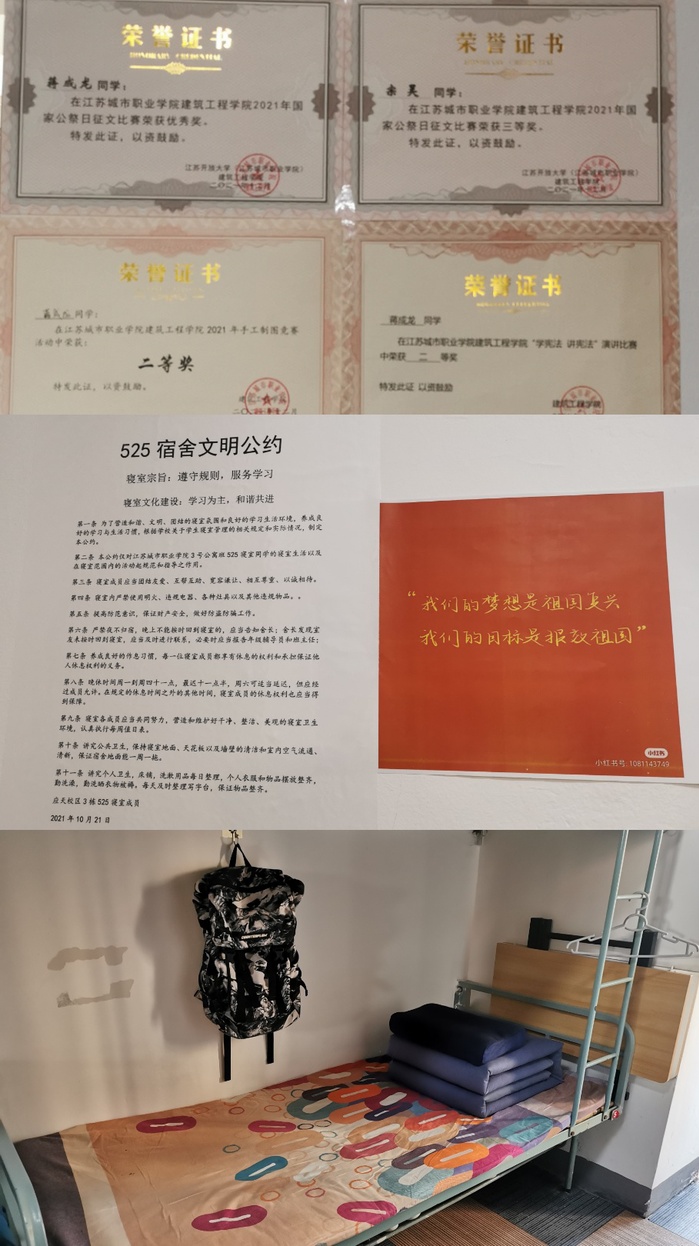 通过精心准备,巧妙设计,各学院打造了一批各具特色的样板宿舍。环境生态学院1-104宿舍主题鲜明,宿舍成员均为退役复学学生,打造新颖独特的军旅风宿舍,展示军人风采;建筑工程学院3-525宿舍成员积极参与学校各项活动和志愿服务,热心服务同学,体现了当代大学生的主人翁意识。艺术学院6-309、商学院4-220、信息工程学院2-113宿舍干净整洁,物品摆放整齐划一,宿舍氛围分外温馨;设计学院2-211宿舍成员均获校级奖学金,同时积极参与多项专业性比赛,取得优异成绩,是名副其实的“学习之家”。