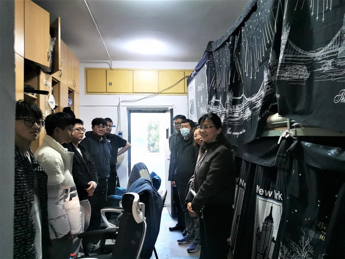 在走访宿舍过程中,校领导与学生亲切交谈,详细询问返校过程、返校后的生活安排、学习情况及毕业打算等,了解学生宿舍卫生、消毒和通风情况。校党委副书记金丽霞感谢同学们对学校疫情防控措施的充分理解和全力配合,提醒同学们要提高防范意识,加强体育锻炼,养成良好生活习惯,保持积极乐观的心态。