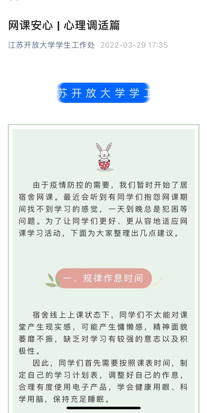 为让同学们更好、更从容地适应网课学习活动,为同学们安心网课保驾护航,我校通过微信公众平台、QQ等方式向大家贴心整理校园封闭管理期间的建议,让大家在疫情封闭期间能够安心学习,维护和谐、稳定的校园环境。