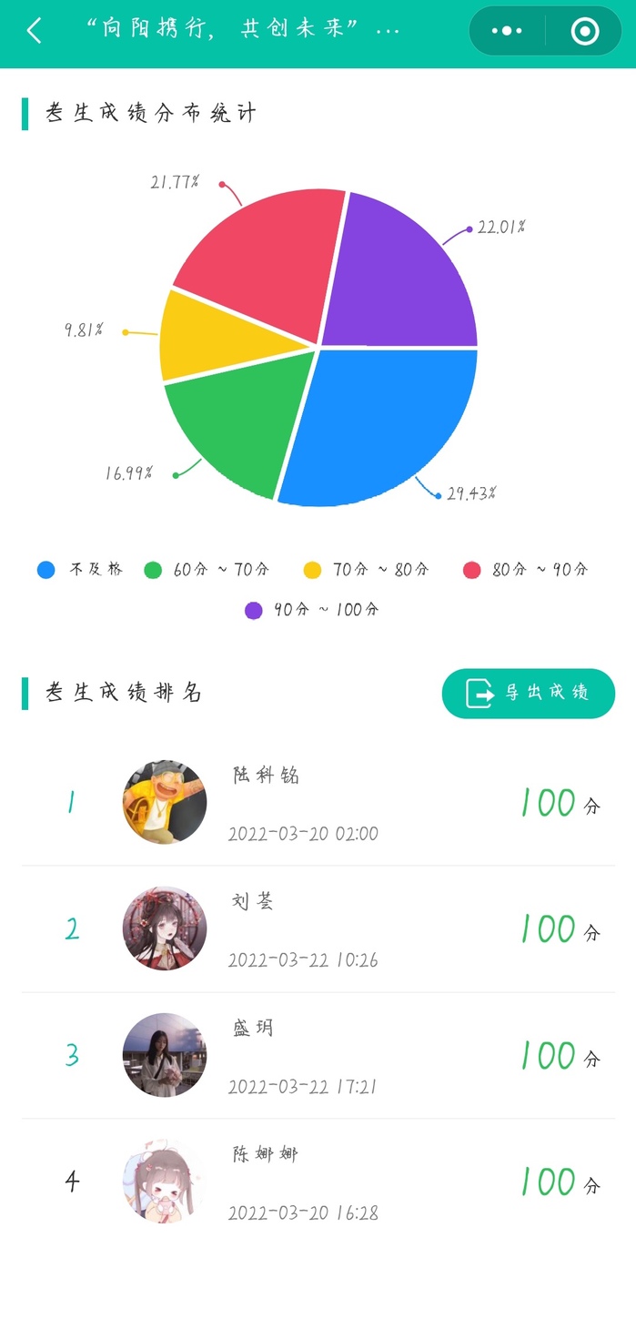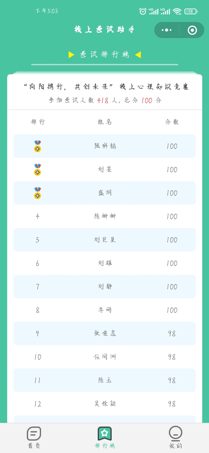 在线上知识竞赛中,各班级心理委员作为心理健康教育网络重要一环积极承担作用,积极发动各班同学踊跃参加。本次竞赛3月20日中午12点正式开始,竞赛的35道题目中涉及心理基础知识、心理技能等等各方面的问题,通过选择题、判断题形式展现给同学们。持续两天的心理知识竞赛吸引到400多名同学参与,并且不少同学取得满分的好成绩。通过此次竞赛,可以让同学们了解心理健康有关的知识,提高了同学们的综合素质,还在一定程度上向同学们普及了心理调解的技能方法,同时也丰富校园文体活动和建设平安校园发挥了积极作用。