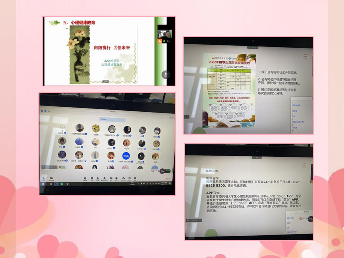 心理健康周以“向阳携行共创未来”为主题,开展了“向阳携行 共创未来”线上心理知识竞赛、“向阳携行 共创未来”主题班会、“同心抗疫”开通24小时心理热线、网课安心心理调适宣传等活动。