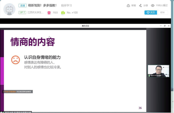 陈老师以两个人从认识到白头偕老的概率约为1/50000的数据揭开恋爱神秘面纱,用爱情取样与评估、互惠、承诺、制度化等进阶图示来说明爱情之不易,用1974吊桥实验来起底爱情的真相——心理的神经生理机制,用镜像神经元分析男女相处的共情差异,用人类的最重要生存能力情商引导同学们理性思索恋爱观。他妙语连珠、观点新颖,深入浅出地为同学们解读爱情心理,后台信息不断涌入,这位南大的“明星老师”感受到了来自江苏开大学子们的 “追星”热情。