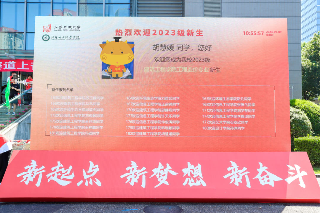 迎新现场,各学院纷纷拿出“杀手锏”,花式迎新异彩纷呈。商学院将新生的姓名组成了商学院姓名墙,新生与学校吉祥物人偶拍照互动。建筑工程学院为新生推荐好书,并准备了时光邮局,新生们纷纷写下对未来的憧憬和希望。信息工程学院开拓者协会的遥控车机器人,与新生和家长热情互动,用科技感助力迎新。环境生态学院为萌新们送上了极具学院特色的绿植积木、蕴藏花种的“绿水青山”号船票,用热情和环保开启新生大学之门。设计学院网红拍照打卡点,留下了新生一张张青春洋溢、充满期待的笑脸。艺术学院用拍立得相机为新生记录入学时刻,并用照片组成“2023”字样照片墙。