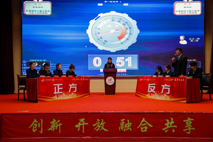 决赛中,各队围绕“短视频的火爆是精神文化丰富/精神文化匮乏的体现”展开激烈辩论。正方以“短视频是精神文化的产物,具有包容性、多样性、时代性、互动性、高效性等优势”立论,指出短视频作为新型文化传播媒体,为社会、个人提供了多样化的展示平台,它的火爆能促进社会经济发展,推动人际关系交流,赋予人类生活和精神文化新的生机。反方以“网红经济裹挟下的短视频内容碎片化、节奏快、门槛低,其博眼球、无底线的流量推送反而削弱人的思考能力,不利于社会健康发展”立论,强调精神文化的创新、传播需要更深度的思考、更宽广的认知和更全面的理解。