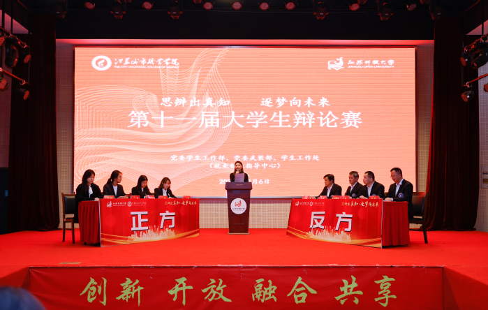 为引导青年学生践行和弘扬社会主义核心价值观,丰富校园人文精神内涵,提升学生综合素质,12月6日晚,我校第十一届辩论赛决赛在应天校区体艺馆406室隆重举行,党委宣传部部长、融媒体中心主任杨濯;党委巡察工作领导小组办公室副主任刘涛;党委学生工作部部长刘慧英;团委书记、大学生艺术中心主任包慧君;原党委组织部部长卢福毅;马克思主义学院副院长陆洋担任评委,各学院师生代表观看比赛。