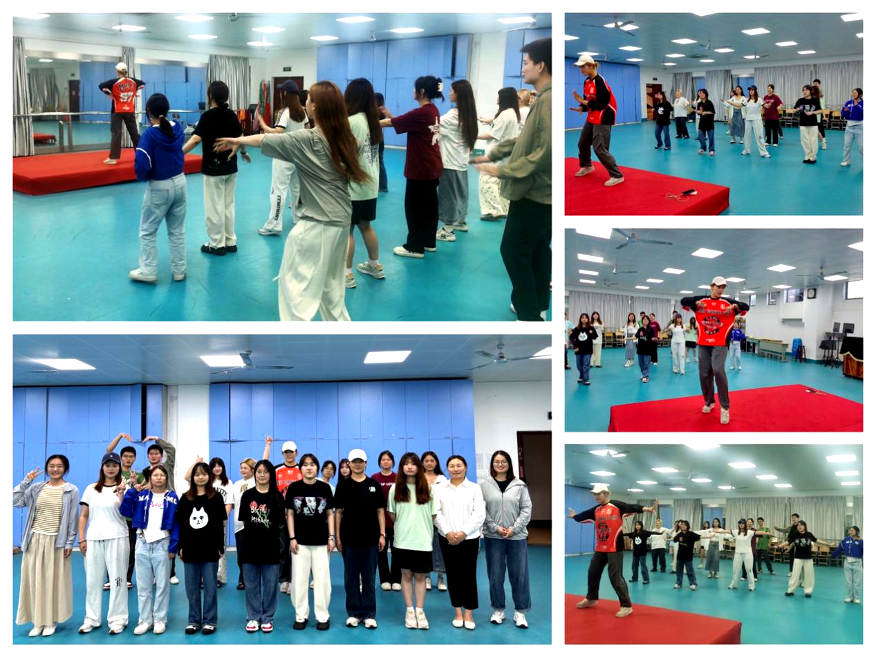 活动伊始,同学们围成一圈,进行自我介绍和暖心游戏,拉近了彼此间的距离,同时在美妙的音乐节奏中感受律动,在一拿二放、一二三四等多种变式中自由摆动,大家的兴致得到了充分调动。随后是令人期待的尊巴舞教学环节,秦一超详细讲解动作要领,耐心带领同学们做出各种舞蹈动作。在她的不断鼓励下,同学们逐渐熟悉了舞蹈中各节拍的对应动作,从开始拘谨疑惑,而后渐渐露出了笑容,在舞蹈中放飞自我,欢快踢腿、摆臂捶手、奋力弹跳,尽情挥洒汗水,感受尊巴的独特魅力,气氛慢慢活跃起来。伴随着动感音乐,同学们在简单的舞蹈动作中卸下压力,体验与人联结的新方式,充分感受到运动带来的乐趣。