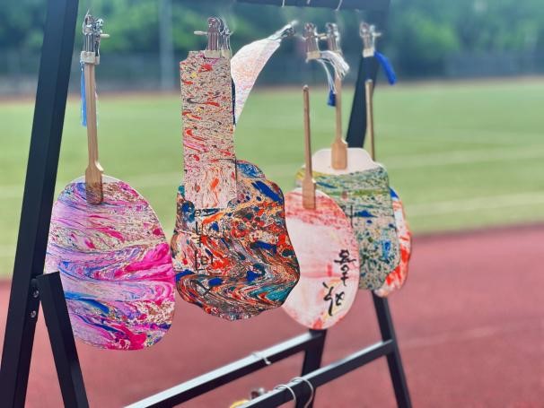 操场上摆放着各种制作漆扇所需的材料和工具。同学们在志愿者的指导下,认真选择材料、调配颜色、绘制图案。他们或低头沉思,或相互交流,场面十分热闹。