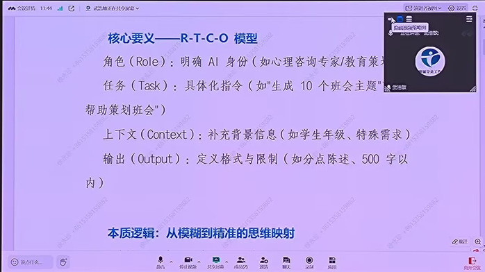 武浩敏老师聚焦AGI在学生服务与工作中的实践应用,着重讲解了向 AI 精准提问的方法,并提出结构化提示词方法论——R-T-C-O 模型。她通过心理约谈方案设计、就业指导痛点突破、突发事件预案设计等案例,生动展示了从模糊到精准提问的过程,让参会者体验结构化思维实操,感受效率提升。