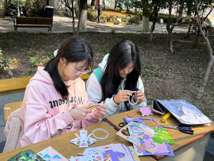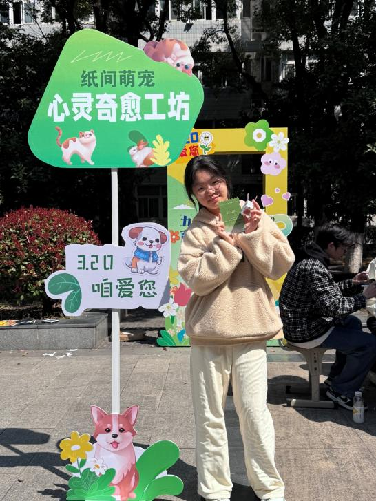 今年的“纸间萌宠”与“心灵奇愈工坊”活动成为全场焦点。同学们通过裁剪、拼贴、绘画等手工形式,将普通的彩纸、毛线、纽扣等材料转化为独一无二的“萌宠伙伴”。憨态可掬的纸艺小狗、灵动可爱的折纸猫咪、创意十足的卡通形象……每一只“萌宠”都承载着制作者的巧思与情感。活动不仅让同学们在动手实践中释放压力、激发创造力,更通过“领养”亲手制作的纸质宠物,赋予情感寄托,传递“陪伴与责任”的温暖理念。许多同学表示:“制作过程中专注又放松,仿佛烦恼都被手中的小生命治愈了。”