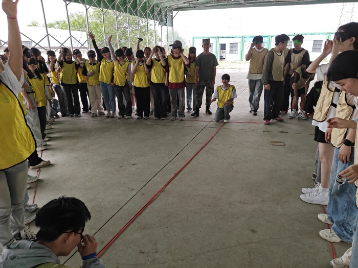 上午的核心项目“盲人方阵”和“雷区取水”考验团队的信任与策略。在“盲人方阵”中,队员们蒙住双眼,仅凭语言沟通将杂乱绳索围成规定图形;而“雷区取水”则需队员在模拟“雷区”内协作取水,每一步都需精准配合。同学们在紧张与欢笑中领悟到“信任是团队的基石”。
