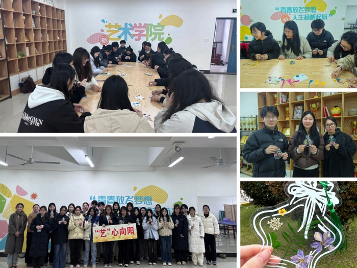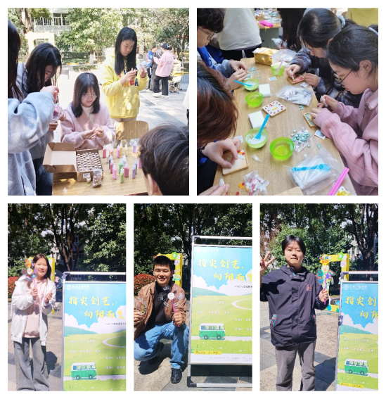 美育是心灵的滋养剂。本年度活动通过多种艺术形式,引导学生感受美、创造美、表达美。校级3·20心理健康广场活动与5·25心理嘉年华打造沉浸式美育空间,商学院“DIY流体熊”以色彩流动传递情绪表达,建筑工程学院“DIY浮雕画”探索空间与立体的叙事语言;信息工程学院“手绘风车”“彩沙瓶”“干花团扇”等活动,在光影流转间体悟生命的律动与时间的印记;环生院、设计学院与艺术学院联袂推出“绘此青绿 春色满园”树叶手工创作、“一叶知秋——树叶创意拼贴”和“瓶子里的春天瓶贴”,引导学生在自然材料的再造中触摸季节的温度,感受万物生长的诗意。此外,设计学院“井盖绘画”以创意涂鸦活化校园角落,传递积极情绪;草地音乐节“音你而来 青春不散”用音符跃动传递温暖,摄影活动“定格时光”以镜头捕捉校园诗意;艺术学院“泥人手作”古法新绎,“芳香疗愈”沙龙香气漫溯,让传统技艺与心灵疗愈相融共生。这些活动将艺术浸润日常,让心灵在创造与感知中自然呼吸。