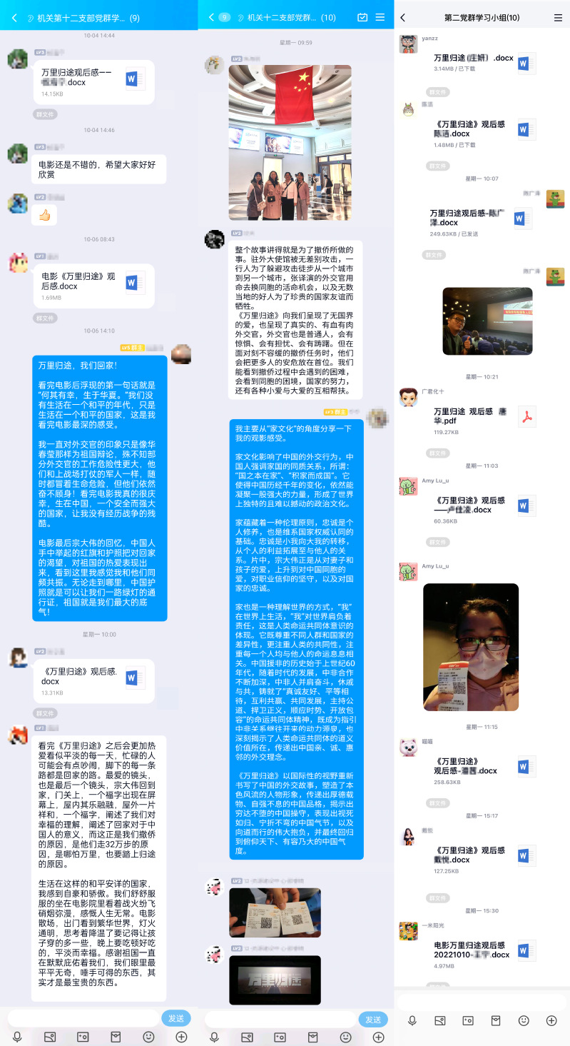“举起你的国旗、护照,往前走”,“我们带大家回家”。分享交流时,唐岩激动地说:“哪有什么岁月静好,不过是有人替我们负重前行。”张文涛、陈广泽等老师表示通过影片对外交官们有了新的认识,他们不仅仅代表国家形象,彰显中国精神、展现中国担当,更是敬畏生命的普通人。朱海丽、潘茜等老师感慨祖国是我们强大后盾和最大底气。杨海宁、龚颖等老师从电影“舍小家为大家”角度展开思考,认为这也是将国之大家落实到每个人的小家,启发我们珍爱和平、珍惜家人。李慧娟、王念春、卢佳凌等老师从电影的表现形式、视觉体验、价值认同谈感受,纷纷表示影片真实感人,引人共鸣与共情,让人感同身受。支部书记乔淑一从“家文化”角度分享,所谓“国之本在家”、“积家而成国”,电影传递出中国品格、中国气节和中国气度。张知慧鼓励大家发扬奉献精神、发挥斗争力量,用奉献之声、担当之行,立足当下,成为时代的奋斗者、奉献者和追梦者,谱写学校向上突破的奋进之路。