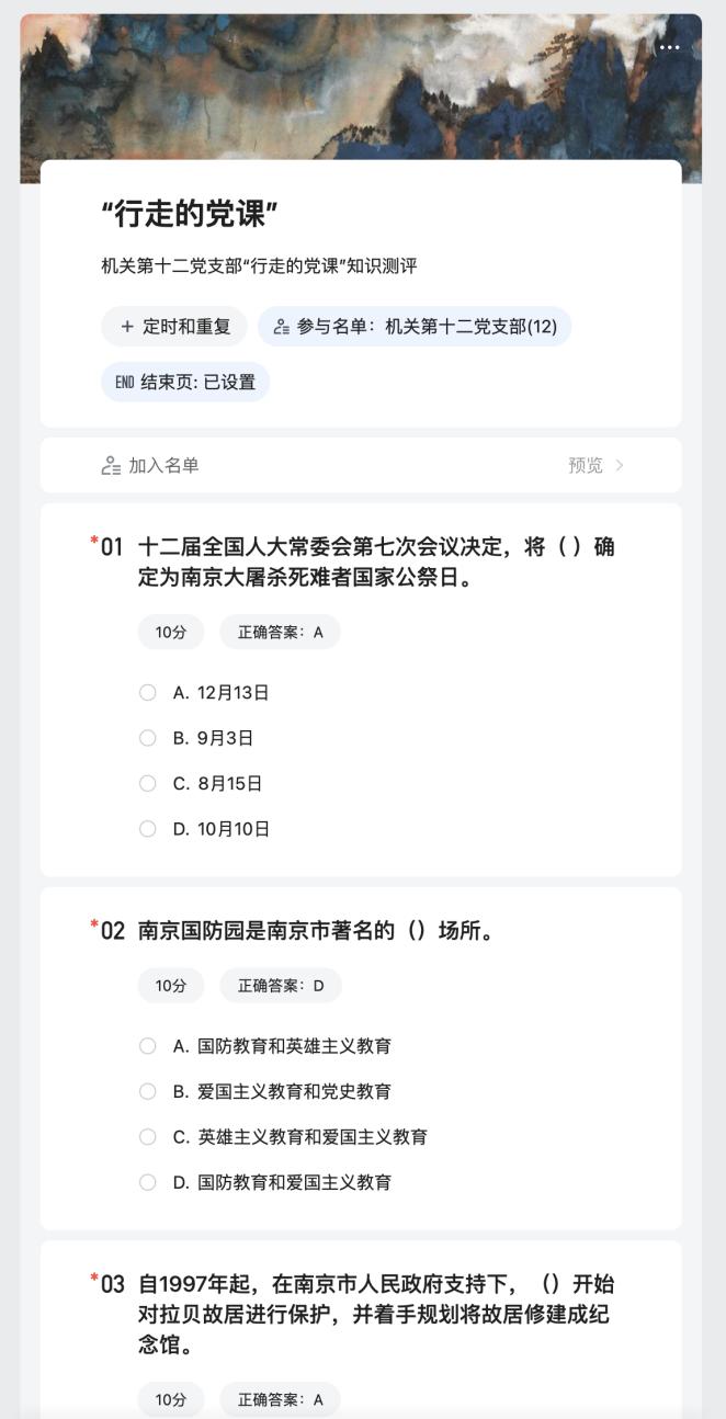 本次主题系列活动分为三条路线,分别是“悟初心”:侵华日军南京大屠杀遇难同胞纪念馆—南京国防园—求雨山烈士纪念碑—拉贝故居;“话变迁”:中山码头—浦口码头—浦口火车站;“承文脉”:云锦博物馆—南京博物馆—南京图书馆—求雨山名人纪念馆。在前往打卡地的路上,为让全体党员能够更加深入了解南京的历史文化,设置了文史答题竞赛,党员们积极踊跃在线答题。