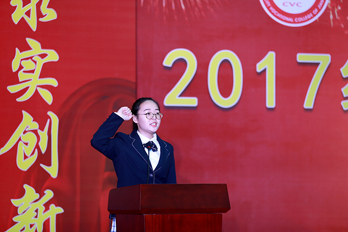 最后,全体2017级新生在校学生会主席陶嘉的带领下举行入学宣誓:恪守“自强奋进”之校训,“明德善学”之学风,珍惜大学美好时光,追求真理,崇尚科学,勤奋学习,勇于实践,诚实守信,团结互助,为成为社会之栋梁而努力奋斗!