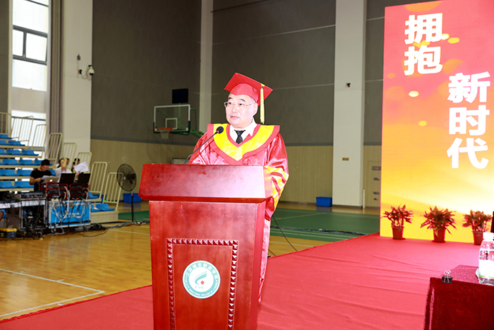 崔新有首先代表学校向全体毕业生致以最热烈的祝贺,向关注同学们健康成长和学校事业发展的家长们表示最诚挚的问候,向为同学们成长成才付出辛勤劳动的老师们表示最衷心的感谢。他以《拥抱新时代•青春向远方》为题,寄语全体毕业生。作为长辈、作为校长,他感慨青春如初春、如朝日,引用李大钊 “故青年者,人生之王,人生之春,人生之华也”,激励同学们珍惜大好青春,志存高远、奋发拼搏。他用四个关键词与同学们话别:一是“家国情怀”。“青年强则国强,青年进步则国进步”,广大青年的样子便是国家的样子。他勉励学子们要铭记马克思、毛泽东、周恩来等伟人事迹,不忘初心,心怀家国,担当起国家和社会赋予的历史使命,在开拓人生、奉献社会的进程中无愧于时代的青春篇章。二是“定位格局”。他以王国维“人生三境”启示同学们“风物长宜放眼量”,希望同学们不计较一时一地的成败得失,不追求虚幻的成功捷径,跳出“小自我”,定位“大格局”。做到仰望星空、脚踏实地、学会思考、善于分析、正确选择;稳重自持、谦恭自省、坚定自励、从容自信、勇往直前。三是“终身学习”。“非学无以广才,非志无以成学”,敬学是中华传统美德,也是当今学习化生存的内在要义,学习能使人目视万里、通晓古今,能使人完善自我、提升能力。“学业有尽,学习无尽”,希望同学们树立终身学习理念,活到老、学到老,用知识拓展生命的广度,用思想累积生命的厚度,在学习中获得前行的力量。四是“道德修为”。“德者,本也”,“大学之道,在明明德,在亲民,在止于至善”。道德之于个人,之于社会,具有基础性的意义,做事为人第一要义即为修德。修大德者方能勇担当,成大业。他引用习近平总书记“明大德、守公德、严私德,其才方能用得其所”,希望同学们要“从善如登,从恶如崩”,铸就高尚道德修为,成为国家栋梁之才。最后他祝愿毕业生们能如大鹏般扶摇直上,不负伟大时代,不负伟大祖国,不负自己的伟大人生。