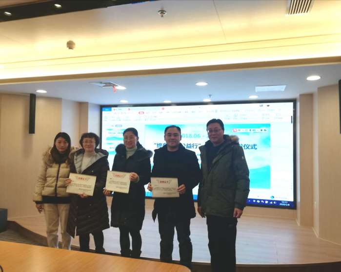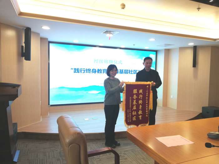 最后,社区代表解凌向学院赠送了“践行终身教育,服务基层社区”的锦旗,五位社区主任分别向公共管理学院全体教师发放了公益活动证书,并合影留念。