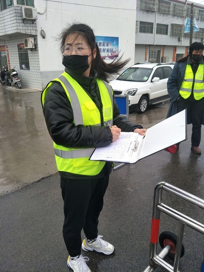 尹韦每天奋战在射阳县五汛镇的大桥口,负责记录对滨海、射阳过境车辆和人员进行登记和排查,以及为驾乘人员进行体温测量,每天执勤时间8个小时以上。她表示,疫情牵动人心,作为一名团支书,一线人员在最危险的前沿战场为我们保驾护航,我们身为志愿者,理应尽己做一些力所能及的事情,为家乡疫情抗战尽一些心力。