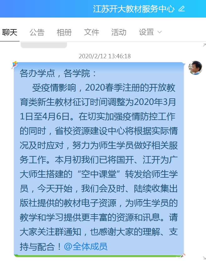 积极协调主动联系,做好教材服务支持。资源建设中心承担着全省开大、城职院各类教材的征订发放和管理服务工作,校本部各学院师生的高职教材已于上学期末提前发放,到位率99%。受疫情影响,部门已研究并通知推迟2020春季注册的开放教育类新生教材的征订时间,同时积极与教材供应商和出版社联系,确保复工后第一时间做好各办学点的教材发放,并将收集到的出版社提供的教材电子资源及时转到全省教材工作群,为师生学员提供学习资源,助力师生“停课不停教、停课不停学”。