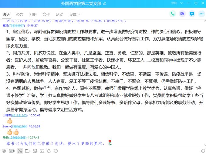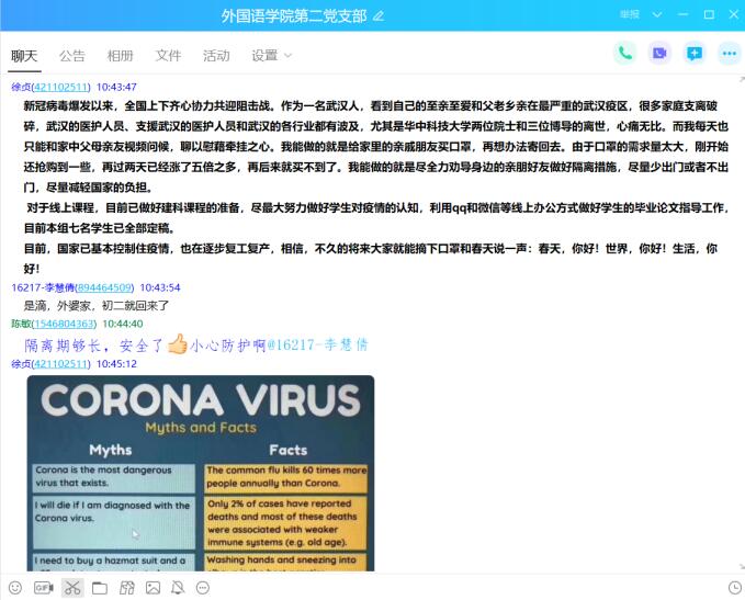 学习结束后,支部利用QQ群在线召开支部会,会议由支部书记陈敏老师主持,支部全体党员师生参加了会议。大家就疫情发生以来个人防护的具体做法,近期工作开展情况,以及特殊时期作为党员、教育工作者、学生、社会公民肩负的责任和担当在群里各抒己见,纷纷表达了对湖北人民的支持,对一线医护人员的牵挂,对祖国的祝福,以及牢记初心和使命,实干报国的决心。