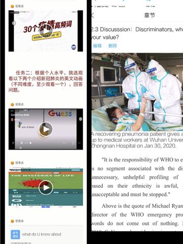 老师们还交流了把“疫情防控”作为大学英语第一讲的教学设计,分享了课程思政教学资源。老师们充分利用英语新闻报道、视频资源等相关资源开展教学,培养学生的语言能力,同时引导学生树立积极的“战疫”态度,思考公民责任,养成正确的价值观。