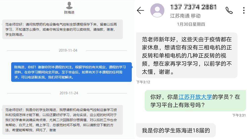 2020年春节刚过,陈海进便主动联系课程导师,希望利用疫情停工的这段时间在家继续学习《机电设备电气控制》课程,并提出,为了方便今后边工作边学习,希望能购买该门课程全套学习资源的愿望。课程导师告诉陈海进,尽管上一学期的常规教学已经结束,但是学校为了方便大家学习,已经在江苏开放大学学习平台上将全部课程资源免费开放了,学生在家也可以利用学习平台查阅数字学材、观看教学视频、在线提出问题,课程导师不仅可以通过平台动态掌握学生学习情况、及时解答问题,还可以通过远程协助指导学生操作仿真实验,及时巩固学习效果。