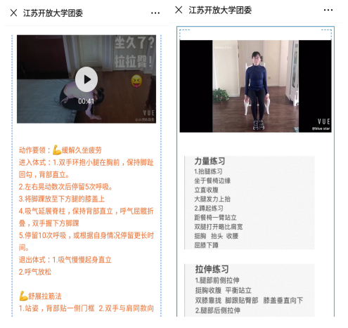 在疫情防控期间,宅在家如何通过运动增强体质、愉悦身心呢?教育学院许悦、白新蕾、张成、赵建华、何康几位老师分别制作了居家健身教学视频,给全校师生员工们居家锻炼提供了参考;视频资料通过学院QQ群、学校团委公众号、江苏省体育局公众号进行发布,取得了良好的效应。