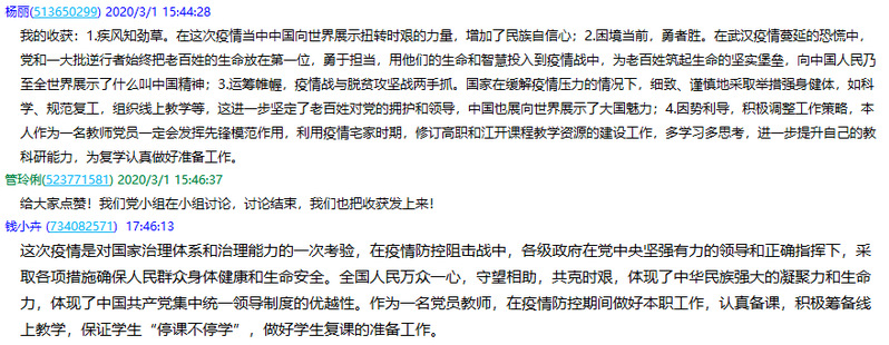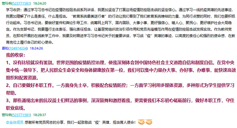 第二阶段,支部全体“思”;支部在“学习强国”平台,以视频会议的方式,组织党员分享学习收获。每位党员结合近期的工作,分享了学习感悟,纷纷表示,开学在即,要把总书记的讲话精神落实到自身工作实际中,学习战“疫”英雄的担当精神,用实际行动践行初心使命。同时,每位党员在视频会议后,还在支部QQ群以文字的方式留下了自己的学习收获。