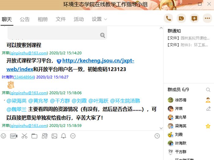 面对疫情,环境生态学院全体教师严格按照省教育厅、学校关于延迟开学的工作要求,充分利用和发挥“互联网+教育”的优势,通过在线教学平台实施在线教学,通过微信、QQ等途径与学生保持联系。