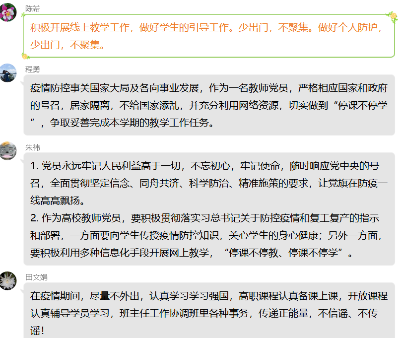 通过此次主题党日活动,支部党员们更加明确了党中央的决策部署,深刻领会了习近平总书记的重要讲话精神,并积极响应学校号召,有序开展线上教学,用实际行动发挥了党员的先锋模范带头作用。