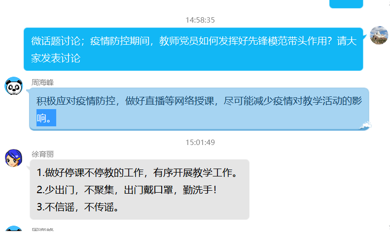 本次党日活动主要有两个方面的内容:一、微党课学习,学习习近平总书记在统筹推进新冠肺炎疫情防控和经济社会发展工作部署会议上的讲话。对于习近平总书记的讲话学习,从五个方面展开,“对于前一阶段疫情防控工作的总结”、“当前加强疫情防控重点工作”、“统筹推进疫情防控和经济社会发展工作”、“加强党对统筹推进疫情防控和经济社会发展工作的领导”、“对于下一阶段工作的三点要求”。二、微话题讨论,全体党员围绕“疫情防控期间,教师党员如何发挥先锋模范带头作用?”主题进行讨论。每位党员均从自身生活、工作的角度交流了自己的想法和安排。