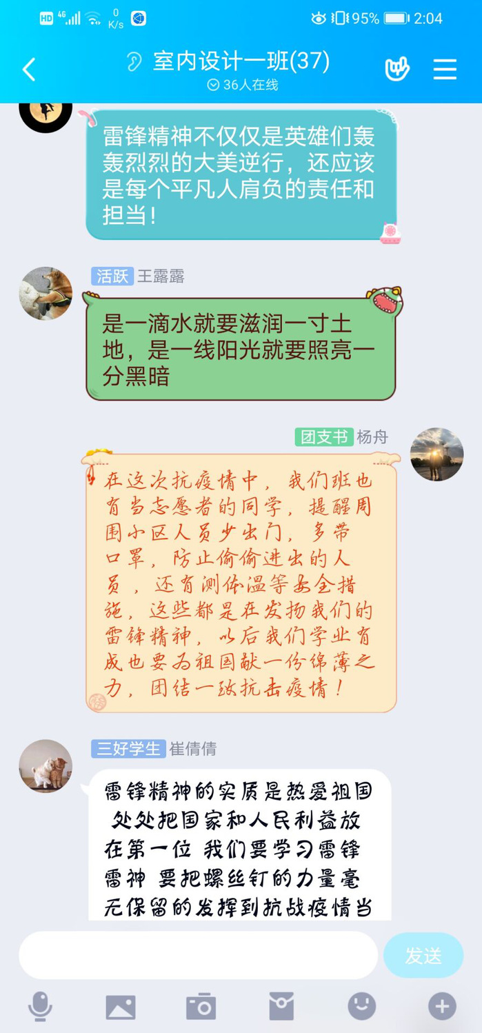 各班同学在团支书带领下观看了视频《习近平讲述的故事:雷锋,永恒的精神坐标》和新华社文章《这一刻,我们为什么更理解更怀念雷锋?》,并围绕学习视频和文章开展了线上讨论。同学们纷纷表达自己所理解的雷锋精神、对此次战“疫”中的医护志愿者、社区志愿者、身边同学在一线参与防控志愿者等事迹展开了热议,同学们纷纷表达了对新时代“雷锋”的敬仰,并结合自身实际进行讨论,大家踊跃发言,纷纷表示要学习雷锋向上的人生姿态和向善的价值追求,从自身做起,从小事做起,积极践行雷锋精神。
