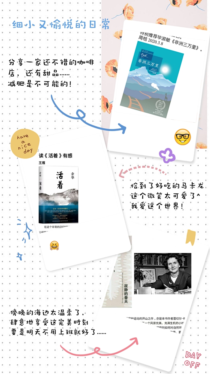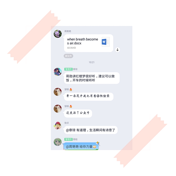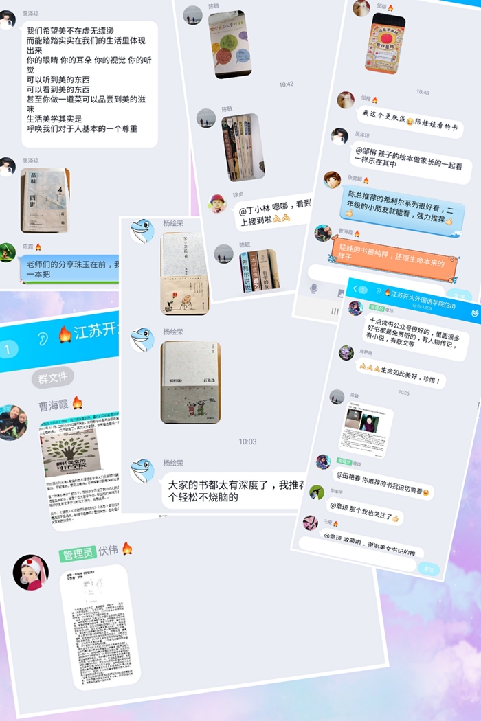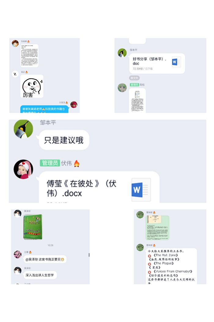 首先,周桔老师与大家分享了毕淑敏的《非洲三万里》。疫情当前,大家对旅游的愿望愈发强烈,很想去探究每处地方的自然、历史、风景和社会的特色。她柔美的声音娓娓道来,在空中与大家相会,开启了读书会的帷幕。接着,徐贞老师、王雁老师分别给大家分享了《静寂的春天》、《活着》两本富有社会哲理的好书。随后老师们纷纷发言推荐好书,有小说、传记文学、自然科学、漫画、政治学、教育学等方面的书籍多达几十本。院党总支部章琼书记给大家推荐了蒋勋讲红楼梦、十点读书公众号和《蜻蜓眼》、《野蜂飞舞》等好书。伏伟老师为大家推荐了大使演讲录《在彼处》,很适合作为大学英语课的素材。大家分享自己的读书心得,讨论热烈,其乐融融。