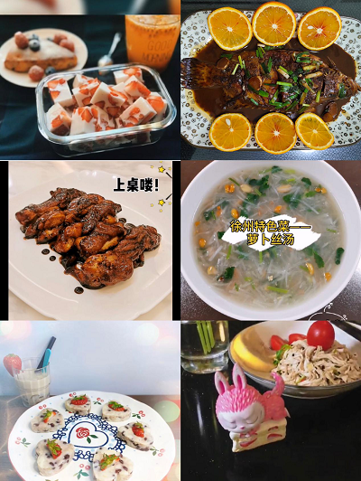 活动中设计学院的女老师们纷纷秀出了自己的招牌美食、各色料理。邹佳老师分享了口味与颜值兼具的草莓椰奶冻,孙培松老师分享了特色徽菜臭鳜鱼,常翎分享了两道日式经典美食,照烧鸡排和日式肉汉堡,李嫣老师分享了徐州特色本帮菜萝卜汤,沈维梅老师分享了时令炒菜芦苇芽炒肉丝和老豆腐制作方法,周莹老师分享了快手减脂餐凉拌鸡胸肉,安克娴老师分享了健康早餐韭菜盒子制作技巧。虽然是在线互动,但依然气氛热烈,学院女老师们用健康美食温暖宅家抗“疫”生活。