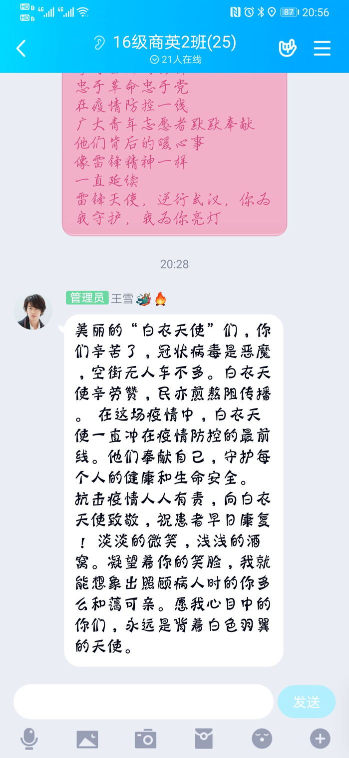 为了深入学习贯彻习近平总书记关于疫情防控的重要讲话和一系列重要指示精神,响应团中央机构“党有号召,团有行动”的优良传统,教育引导广大团员学习雷锋精神,2020年3月8日,外国语学院2016级2班团支部开展了主题为向“当代雷锋”——最美白衣天使致敬活动,本次活动通过云直播的方式的进行开展。