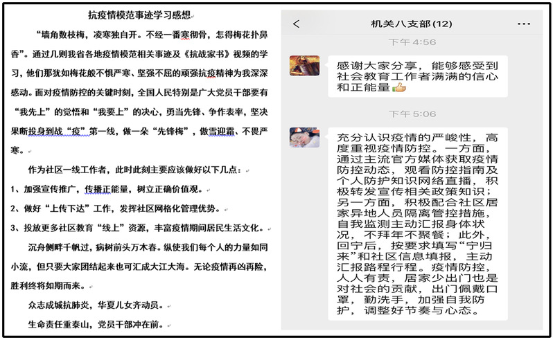随后,全体党员围绕“新冠病毒疫情防控期间,结合社区教育工作,教师党员如何发挥先锋模范作用?”这一微话题畅所欲言,结合特殊时期如何进一步做好本职工作进行讨论与分享。
