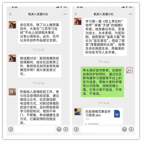 3月8日下午,机关八支部开展了“让党旗在防控疫情斗争中高高飘扬”的网上主题党日活动。本次党日活动运用了“江苏学习在线”平台和支部微信群进行线上学习、讨论与分享,活动由支部书记张曌曌主持。